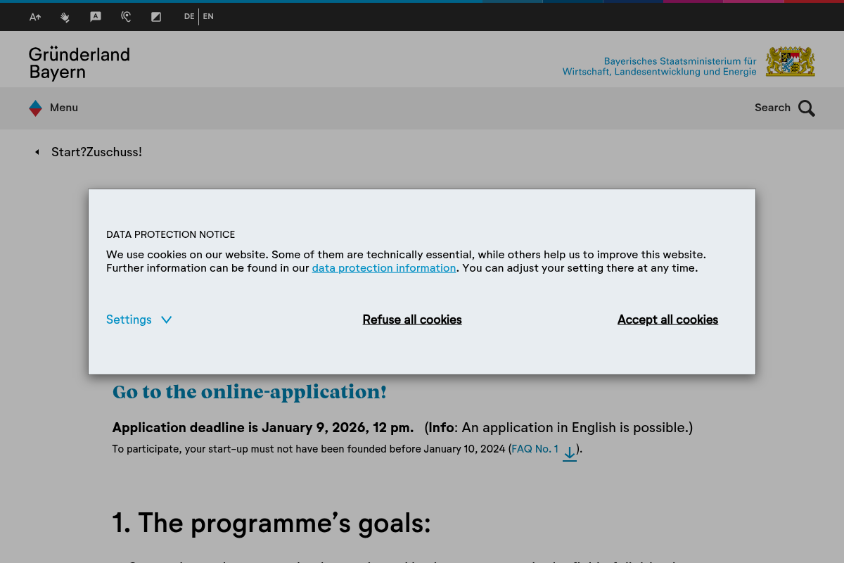 The "Start? Grant!" program offers funding support of up to €36,000 for technology-oriented startups in Bavaria focusing on digital innovation, providing essential financial stability and mentorship to help them develop and market their products effectively.