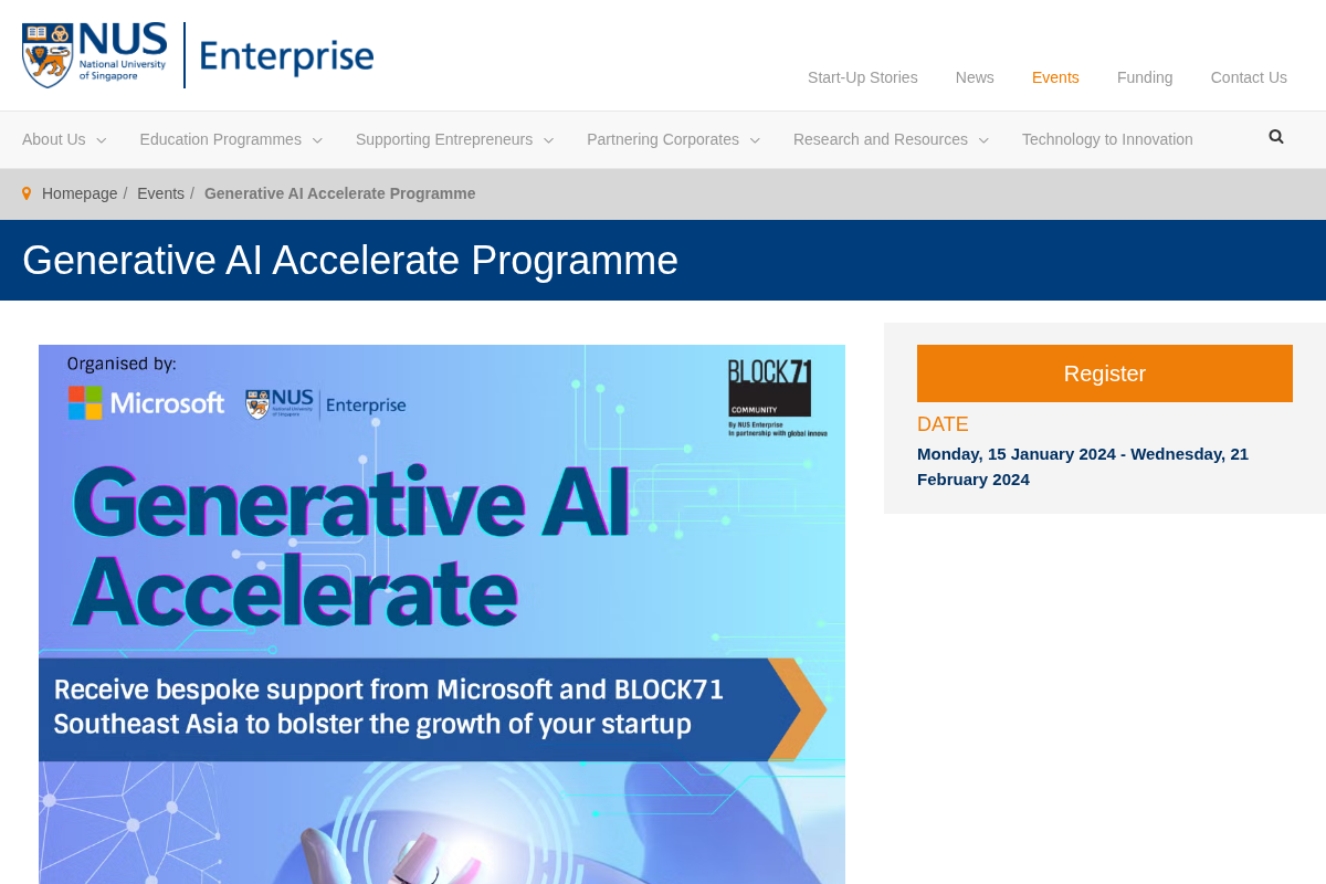 The Generative AI Accelerate Programme, organized by NUS Enterprise and Microsoft, is an 8 to 10-week acceleration program aimed at pre-seed to pre-A stage startups focused on generative AI applications, providing them with essential support such as access to Microsoft Azure, expert guidance, and opportunities for funding and market expansion, primarily targeting startups in Southeast Asia including Singapore, Vietnam, and Indonesia.
