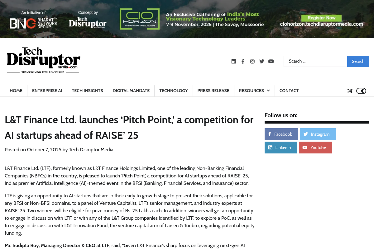 L&T Finance Ltd. is hosting the 'Pitch Point' competition aimed at early to growth-stage AI startups, offering a chance to win Rs. 25 Lakh and collaborate on innovative projects in the banking and financial services sectors, with applications due by October 20, 2025, and the final event taking place on November 7, 2025.