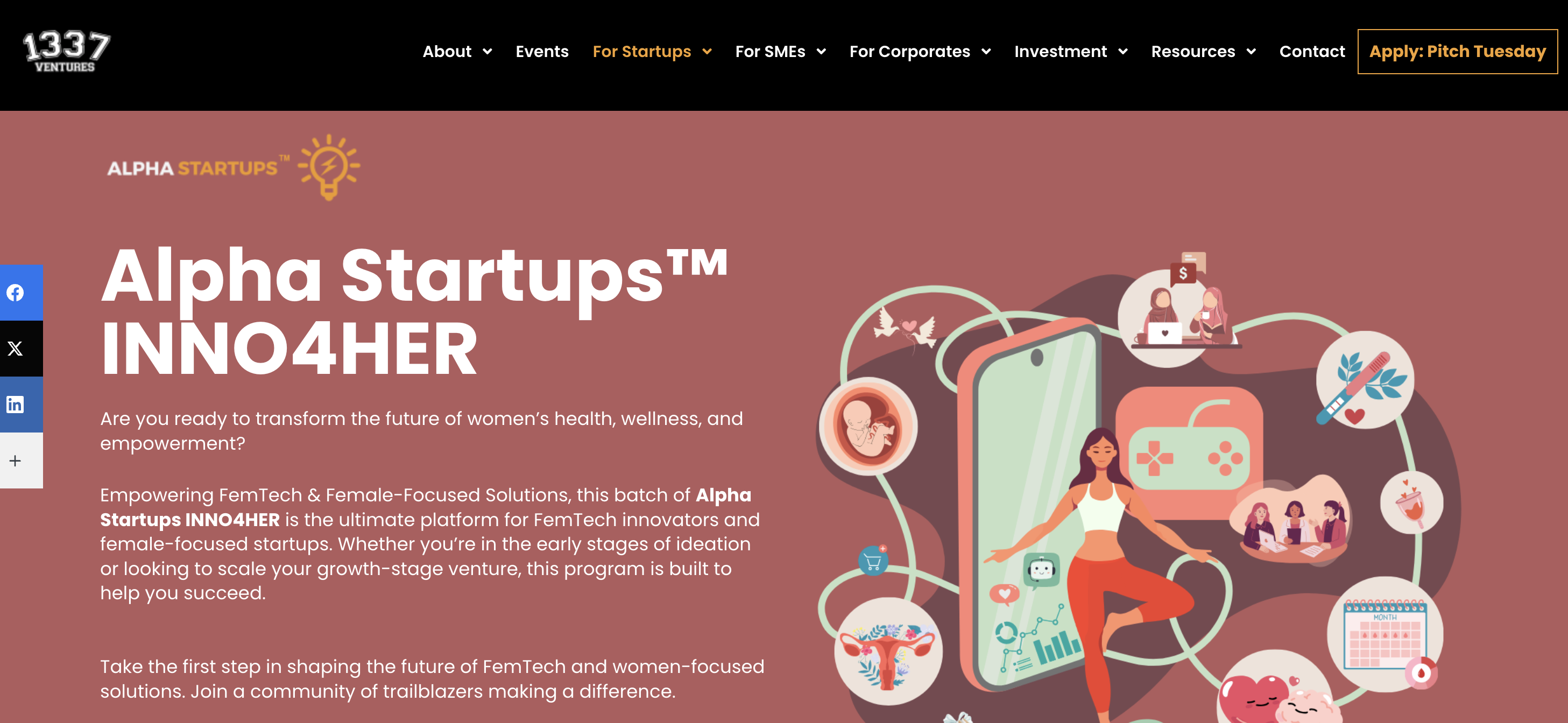 The Alpha Startups™ INNO4HER 2026 Accelerator is a hybrid program designed to support early-stage and growth-stage startups focused on FemTech and women-led innovations, offering extensive mentorship, resource support, and funding opportunities to help teams validate their products and scale effectively.