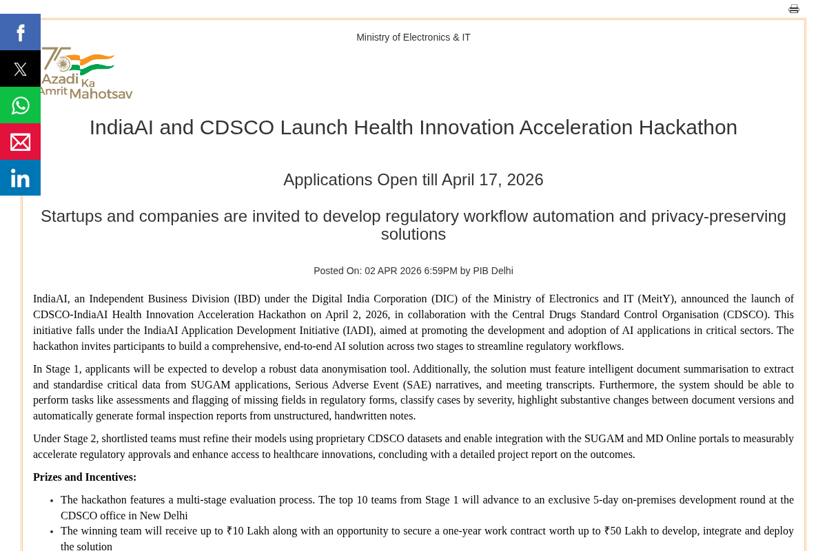 CDSCO-IndiaAI Health Innovation Acceleration Hackathon 2026