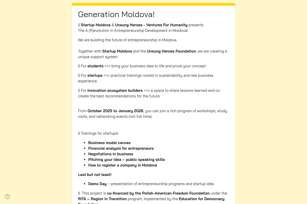 - Targeted at those involved in the startup innovation sector within Moldova.