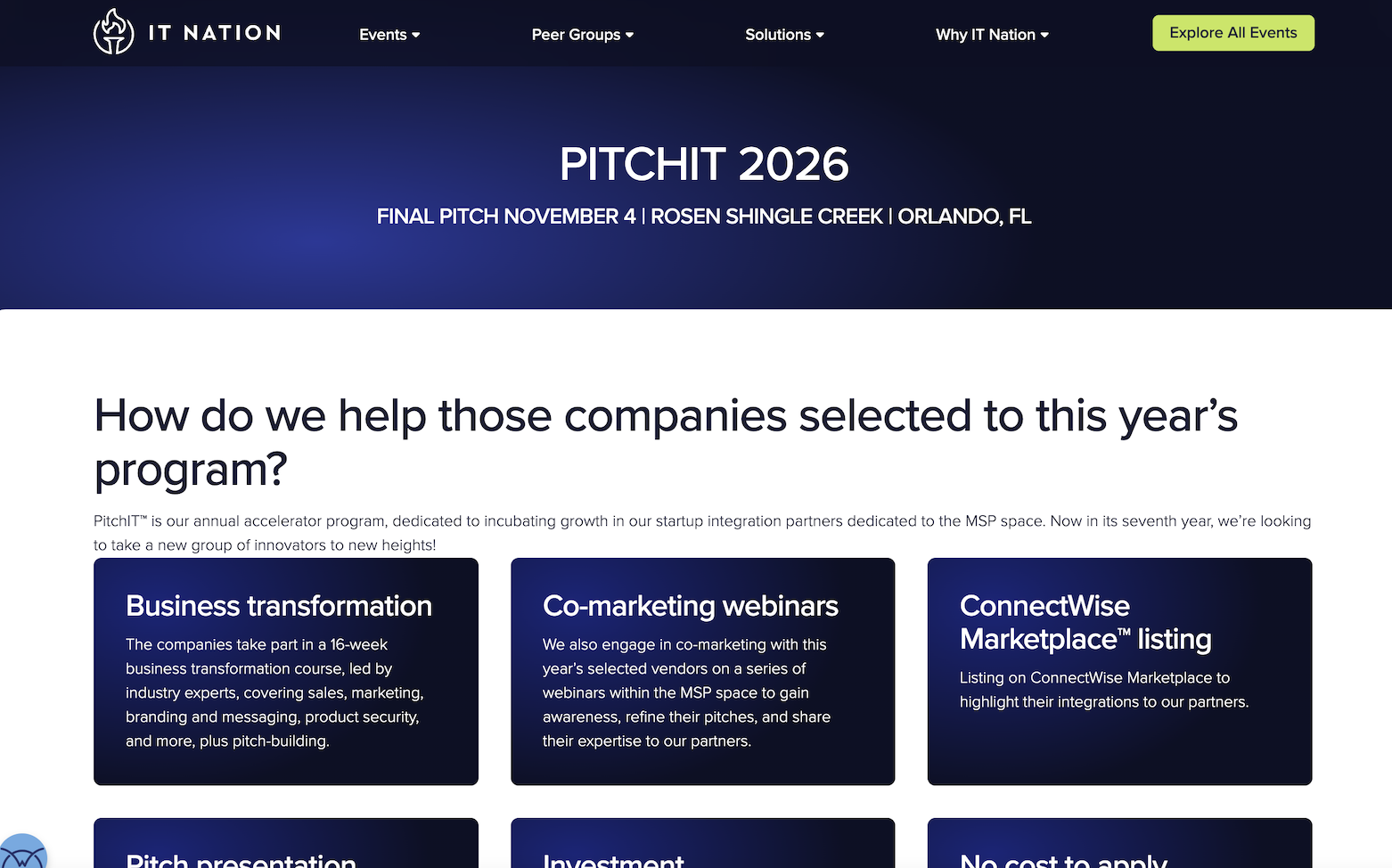 A 16-week accelerator program designed for founders building innovative solutions in the MSP space, offering mentorship, training, and the chance to win significant cash prizes. Participants will engage in a masterclass focused on essential business skills and have opportunities for co-marketing and exposure in the ConnectWise Marketplace. Finalists will also receive coaching and present their pitches at a major industry event.