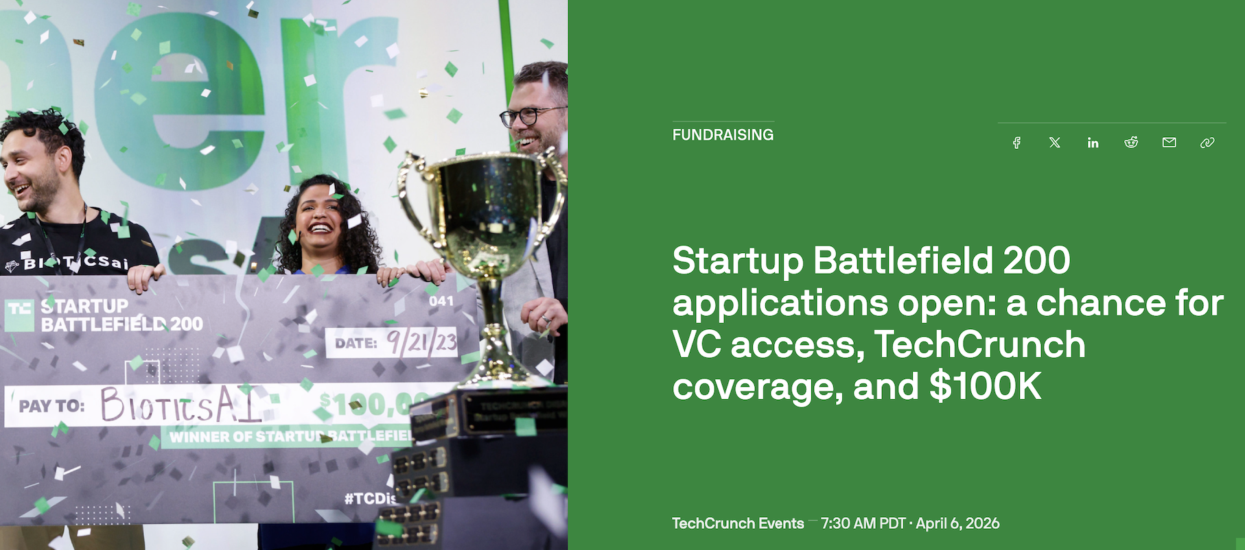 A competition offering startups the chance to win $100,000 in equity-free funding, gain exposure to top-tier investors, and participate in the prestigious TechCrunch Disrupt event in San Francisco. This opportunity is open to startups from any industry and country, encouraging innovation and growth through networking and visibility.